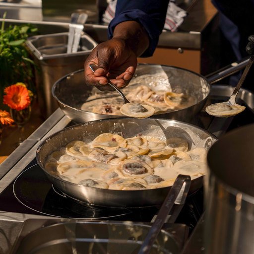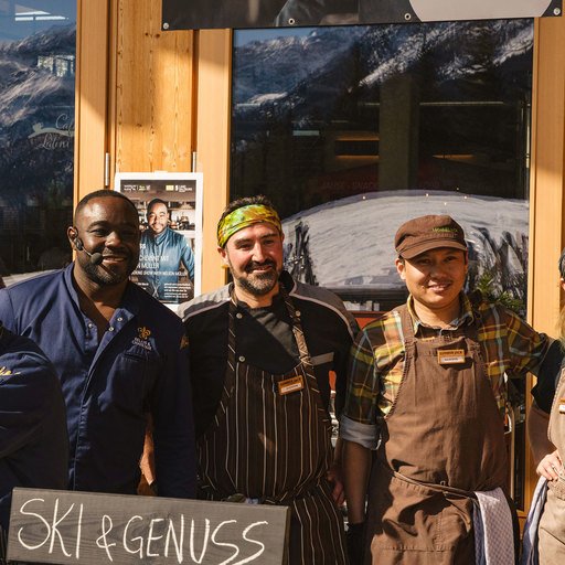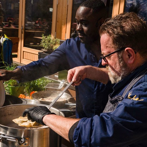 Das Ski & Genuss Gericht ist Zwiebelravioli mit Bergkäsesauce und Alpenkräuteröl - mit vielen regionalen Lebensmitteln von Bio aus dem Tal. Nelson verbrachte den Tag mit 3 LIVE Kochshows bei uns.