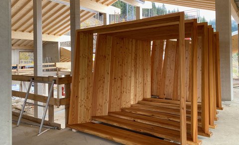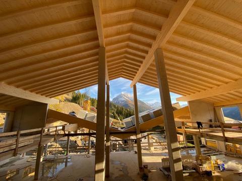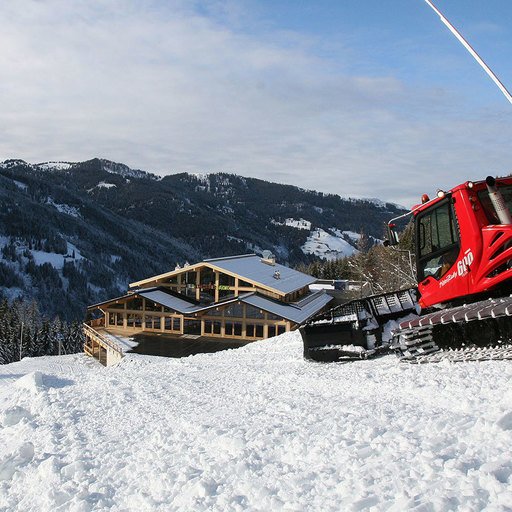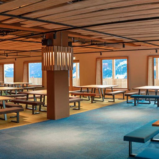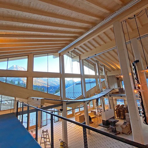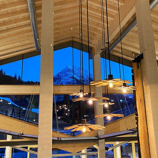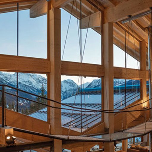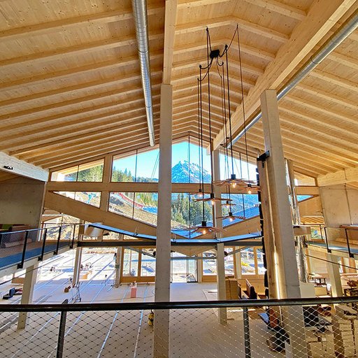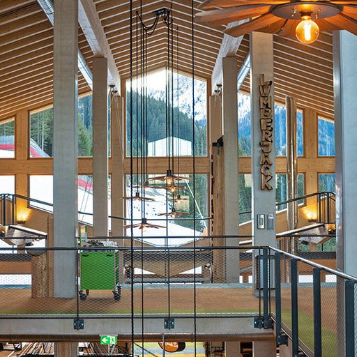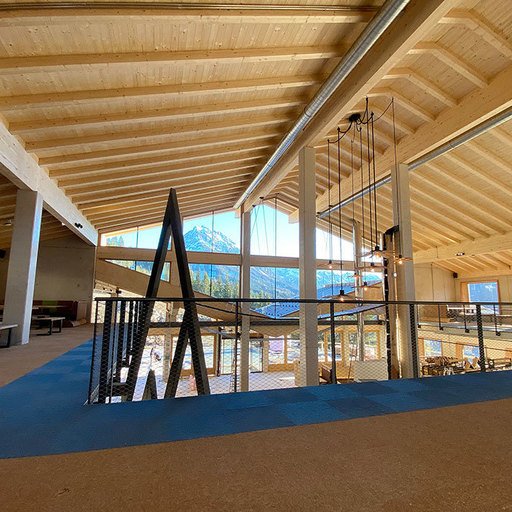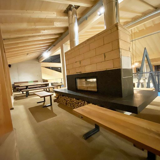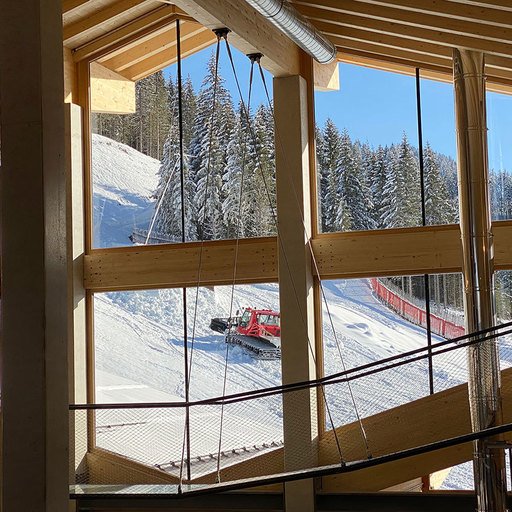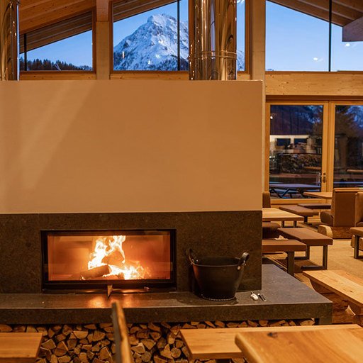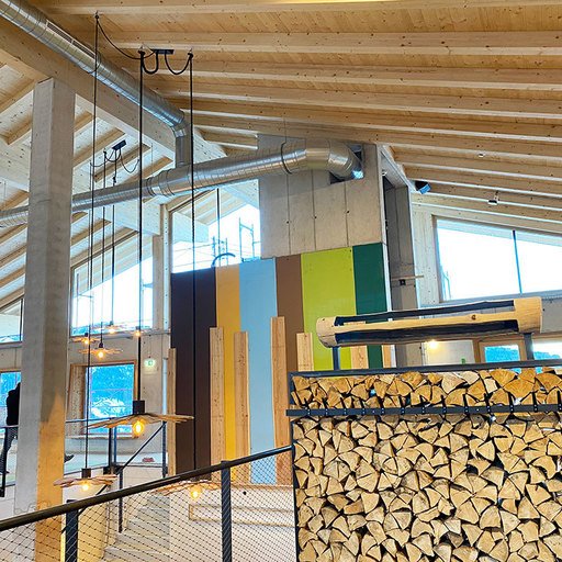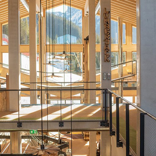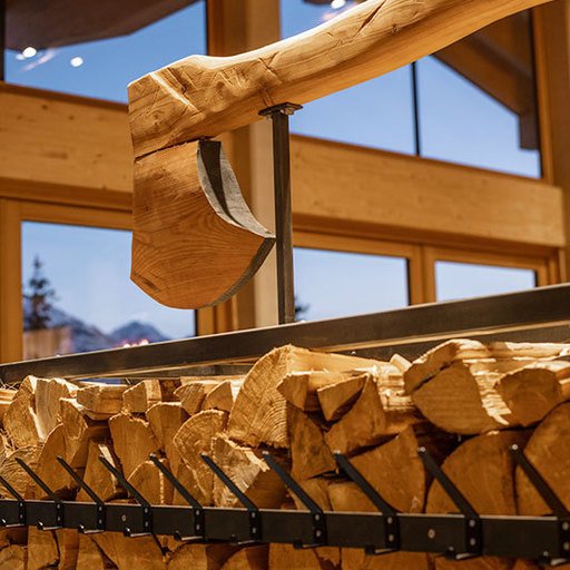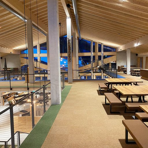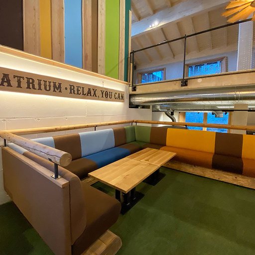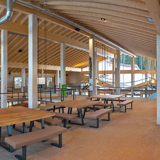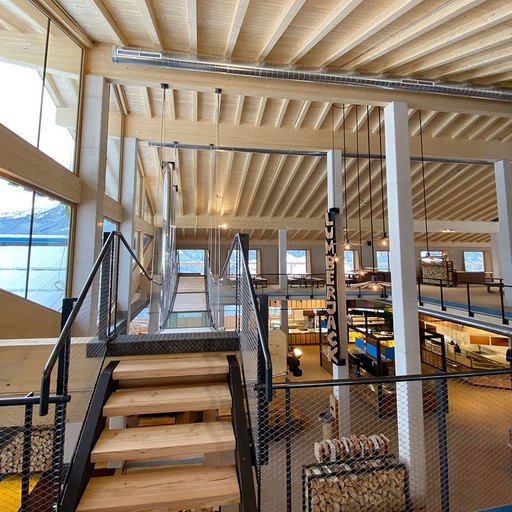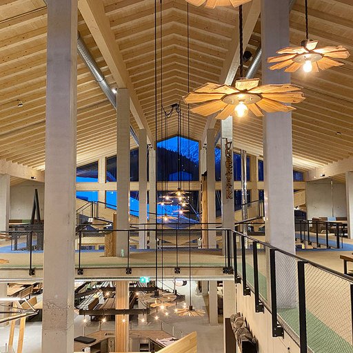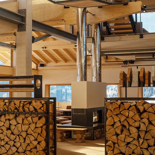 The lowest area 'LUMBER HALL' is designed for KIDS & TEENS in groups with their ski instructors. This level has its own entrance, a large west-facing terrace and - like every area - a large wood-burning stove, a children’s cinema with a seating atrium and, a play area and sanitary facilities.