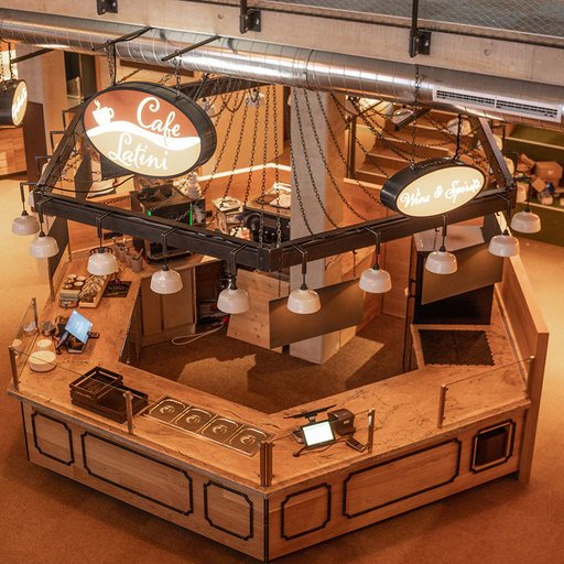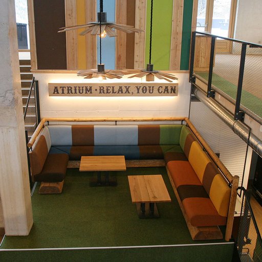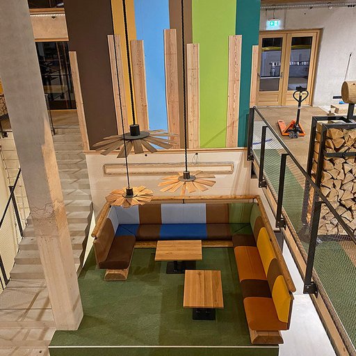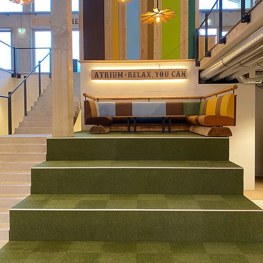 The staircase to the upper floor leads past the green ATRIUM - with a 5-level seating atrium and a podium with an XL wraparound sofa corner. Beneath the atrium lies a play area for kids with LUMBERJACK building blocks.