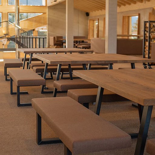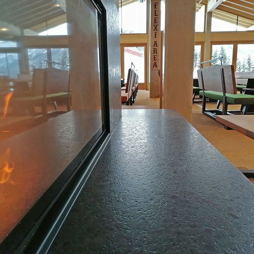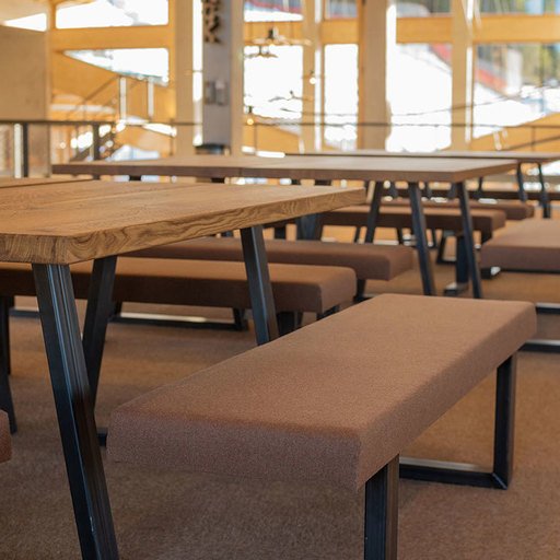 The second area, at the ground level from the piste, immediately on the left at the entrance is the FLEXI AREA. The tables with large oak tabletops and black steel substructure are mobile and can be moved along rails from indoor to outdoor and back depending on the weather.