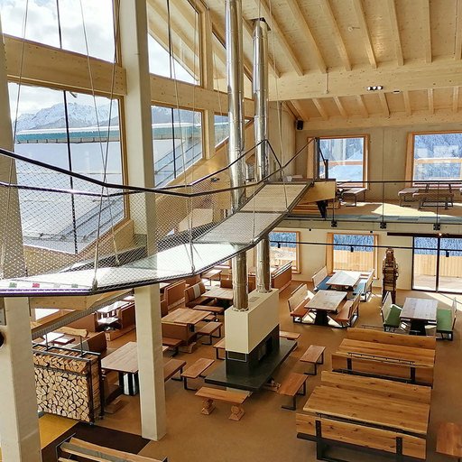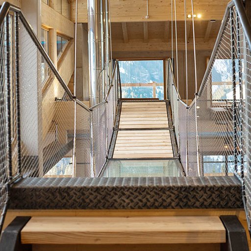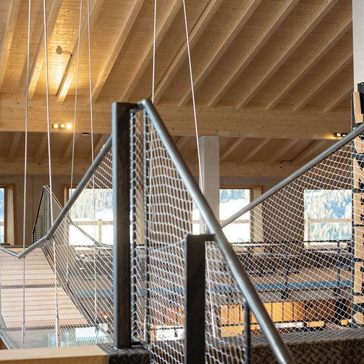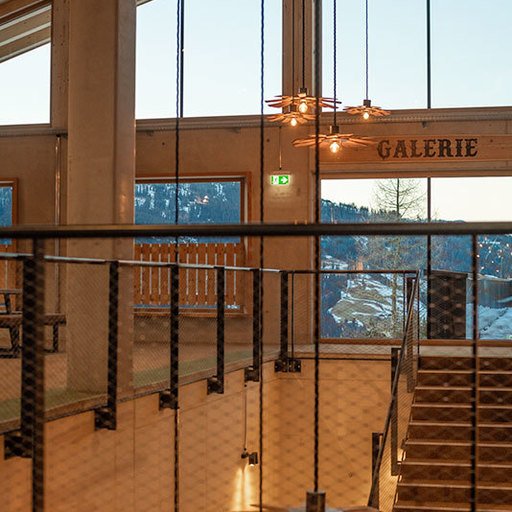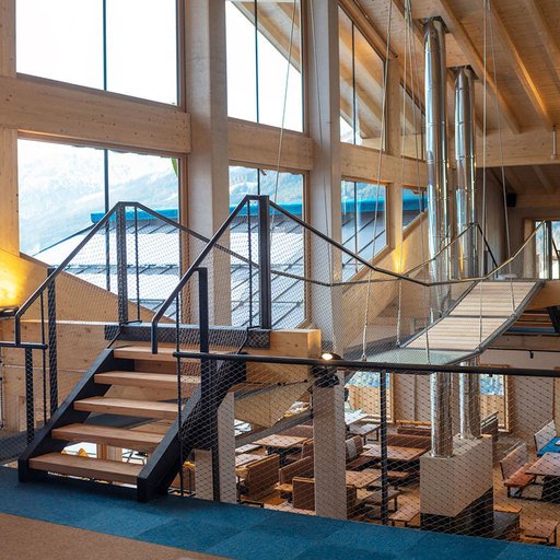 The GALLERY on the upper floor and directly beneath the gables is the area where guests with group reservations enjoy their time. A large wood-burning stove is on the east side. Both sides, east and west, have outward-facing terraces. The highlight is a swing bridge in front of the south-facing panoramic window.