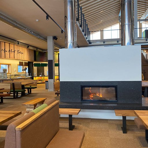 Of course, the Flexi Area and the Lounge also feature a wood-burning stove with double-sided glass framing and an wraparound stove bench.