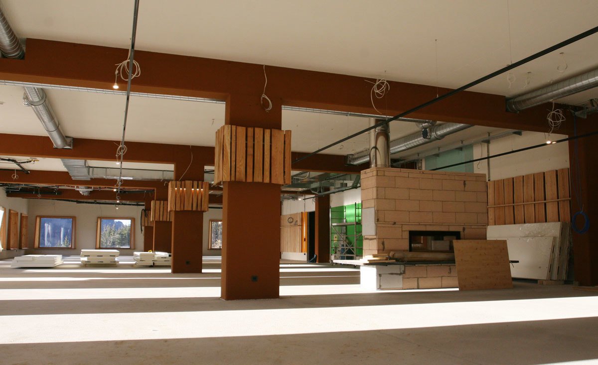 The lowest area 'LUMBER HALL' is designed for KIDS & TEENS in groups with their ski instructors. This level has its own entrance, a large west-facing terrace and - like every area - a large wood-burning stove, a children’s cinema with a seating atrium and, a play area and sanitary facilities.
