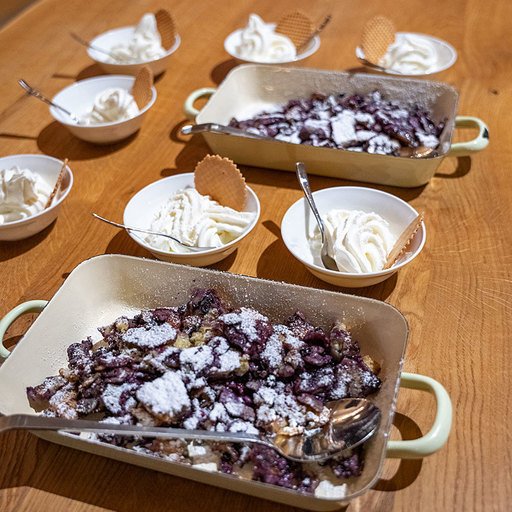 5th Course – Dessert – Schmarrn & Ice CreamBlueberry "Schmarrn" from the Naschkatzl station and frozen yogurt, or alternatively chocolate-vanilla soft ice cream from Café Latini